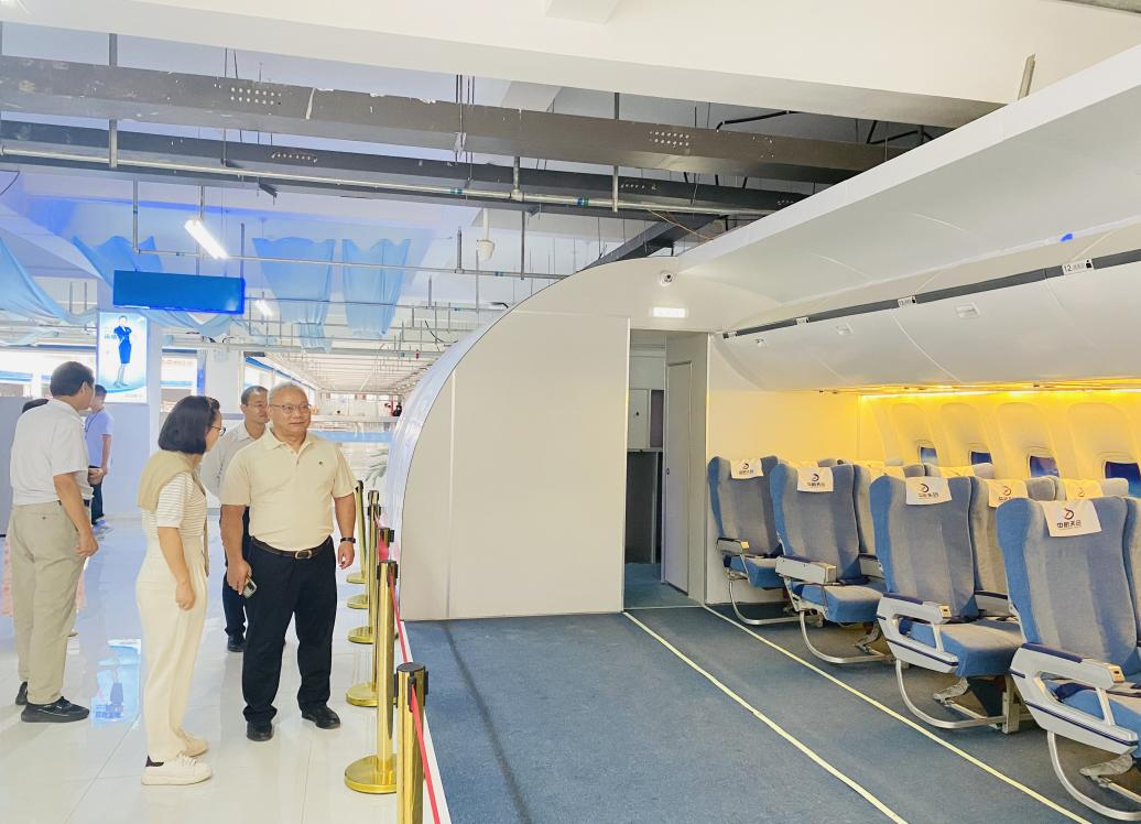 圖為張海成書記一行參觀我院空乘與高鐵學(xué)院實(shí)訓(xùn)基地——仿真機(jī)艙